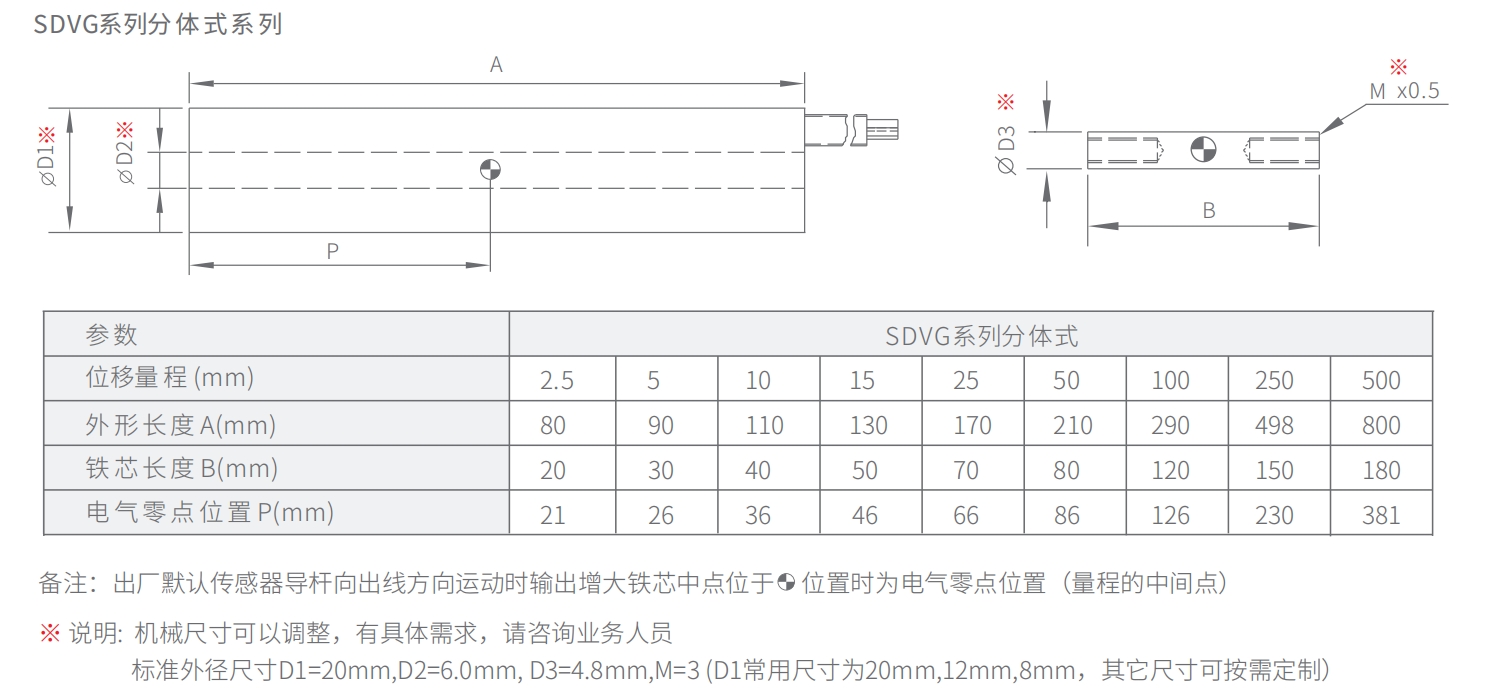 LVDT displacement sensors come in three basic types: split type, rebound type, and pneumatic type, and can be customized according to customer requirements. The measuring range of the split LVDT is 0-500mm, waterproof, dustproof, and has good dynamic characteristics; The measuring stroke range of rebound LVDT is 0~100mm, and the contact probe is made of wear-resistant chrome plated hard tool steel. The measuring stroke range of pneumatic LVDT is 0~15mm, and the working pressure is 0.15~0.7MPa.